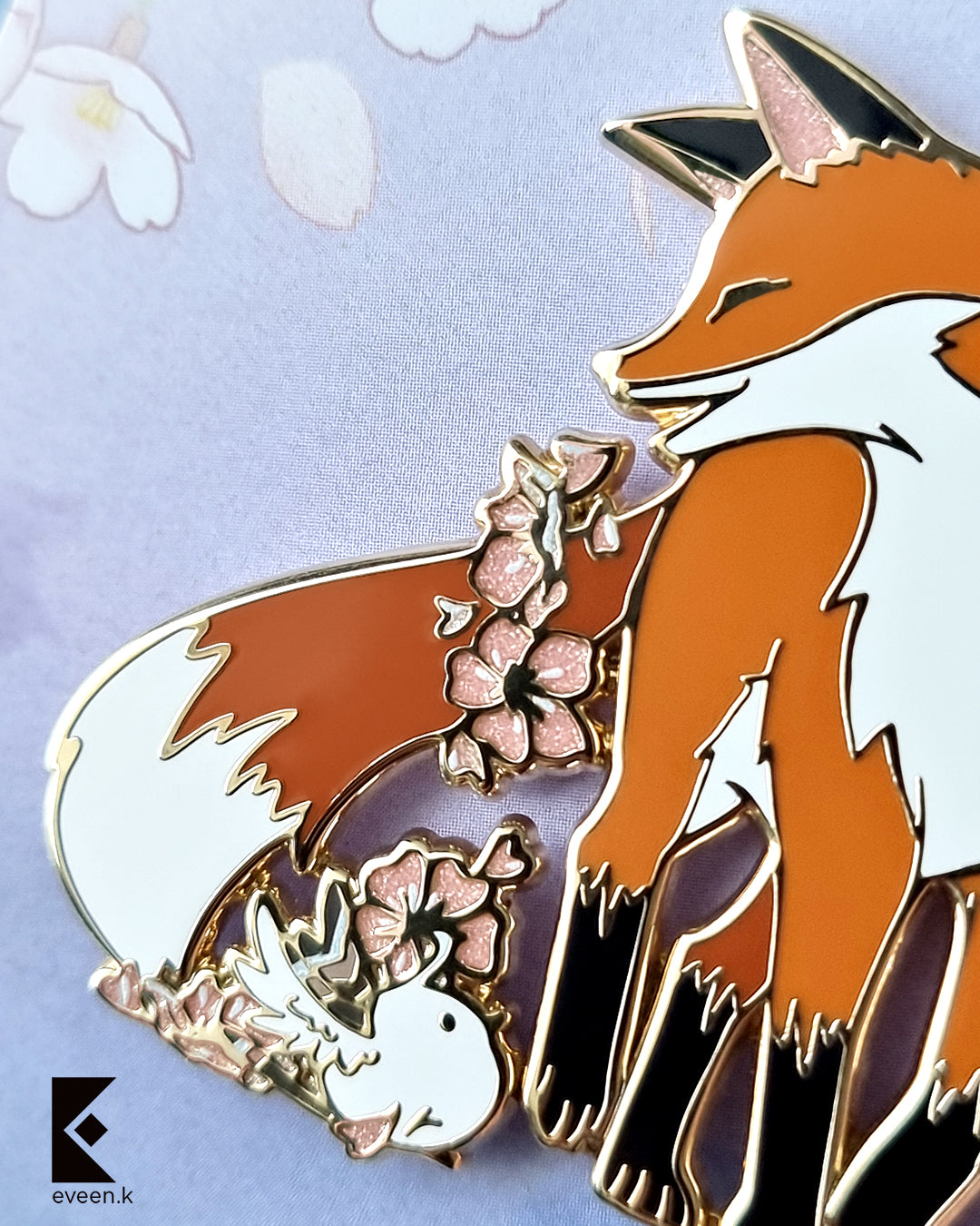 Original Enamel Pin design featuring my favorite animals: a red fox and snow fairy bird! I'm working on a story called Claws, Wings and Cooking Things featuring them.