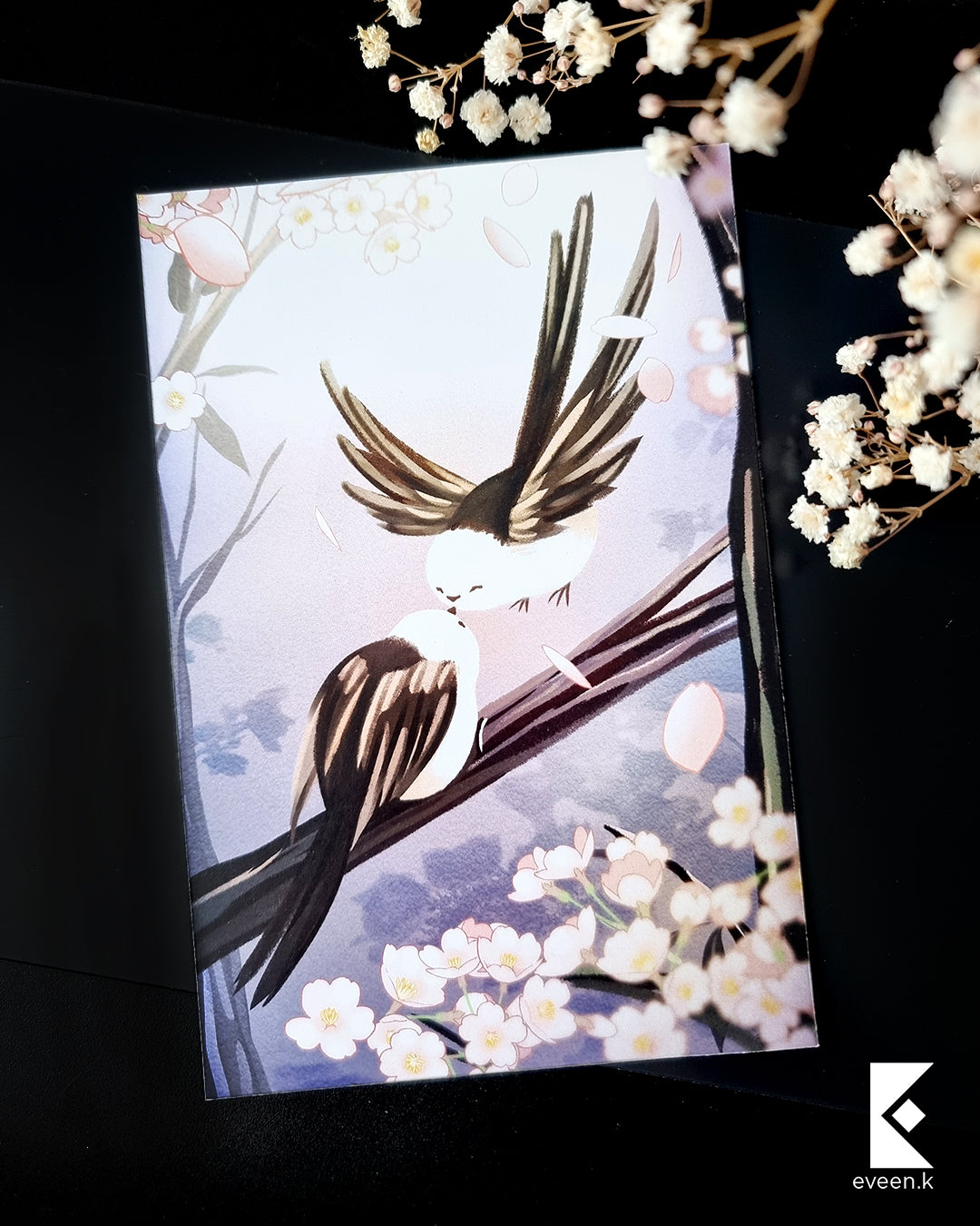 Prints featuring adorable snow fairy birds among sakura flowers!