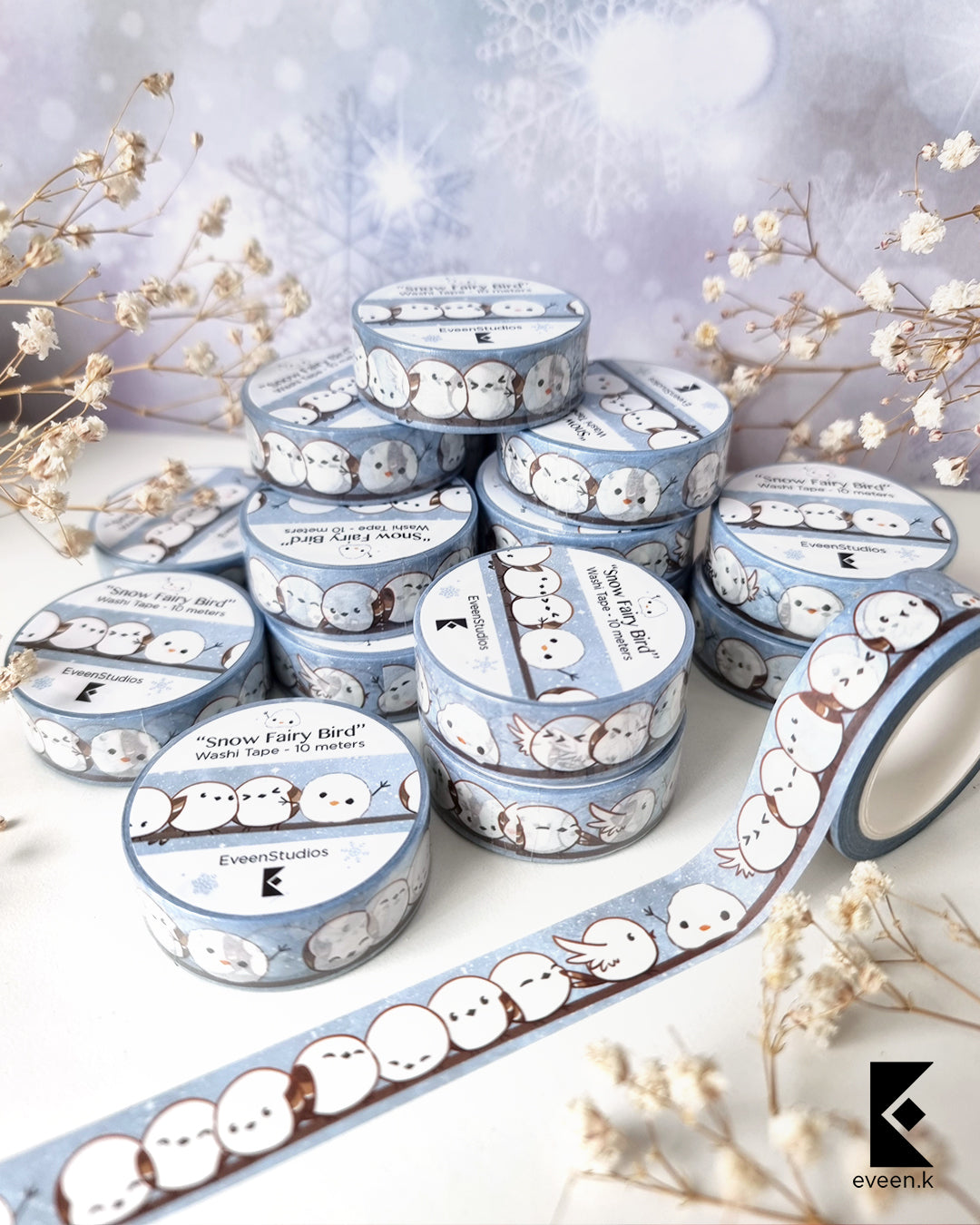 Gold and CMYK Washi Tape. Original design inspired by cute snow fairy birds discovering a tasty strawberry garden and another design featuring them huddling together for warm under the snowy weather. One of them might be a snow bird, but not a snow fairy!